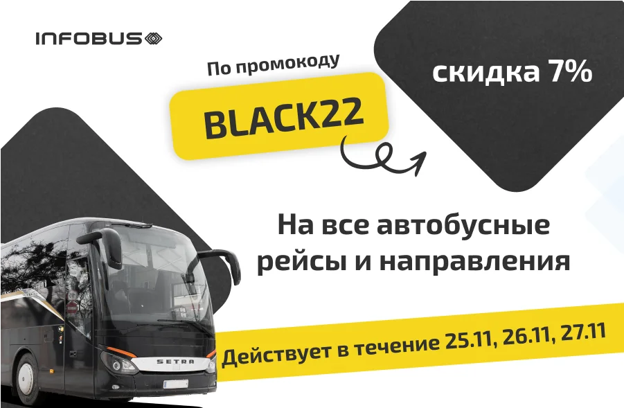 Черная пятница в INFOBUS - распродажа автобусных билетов! Самая ожидаемая акция ноября уже скоро порадует всех клиентов нашего сервиса! Выбирайте направление в Европу, из Европы и по Украине и скорее хватайте билеты! Только три дня: с 25 по 27 ноября включительно - воспользуйтесь промокодом BLACK22 при покупке автобусных билетов на любое направление и получите 7% скидки!