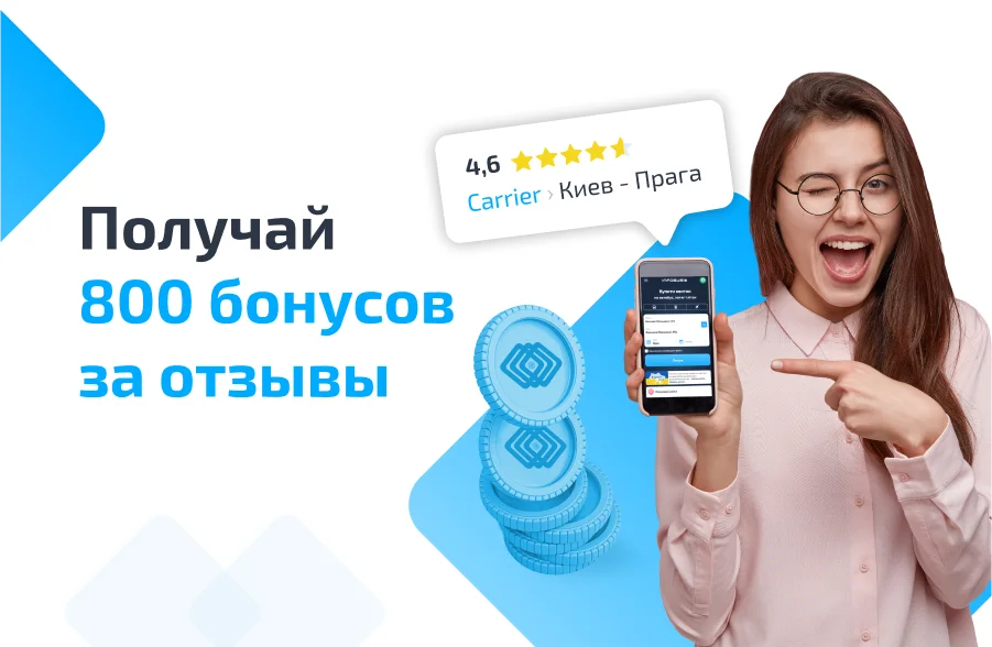 Друзья, привет! Мы снова с хорошими новостями к вам! С сегодняшнего дня и до 18.12.2022 г у вас будет возможность получить до 800 дополнительных бонусов на свой личный счет за хорошие отзывы о компании, которые потом можно превратить в скидку до -50% при покупке билетов.