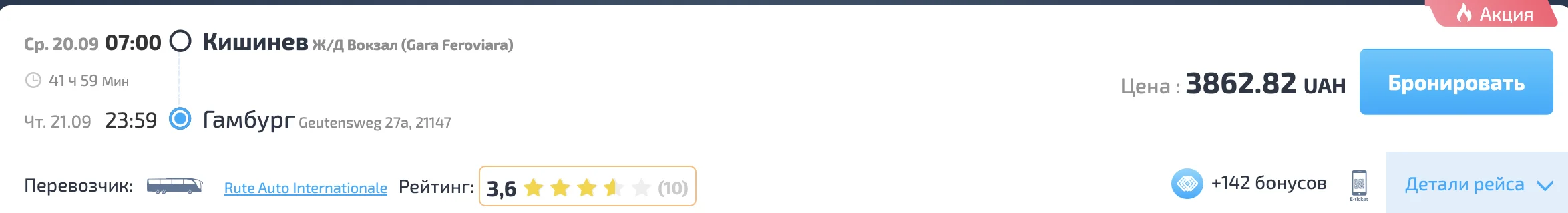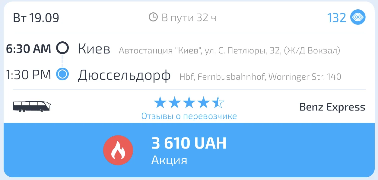 Для использования скидки необходимо приобрести автобусный билет на рейсы в или из Германии у конкретных перевозчиков. Список перевозчиков и примеры рейсов опубликуем.