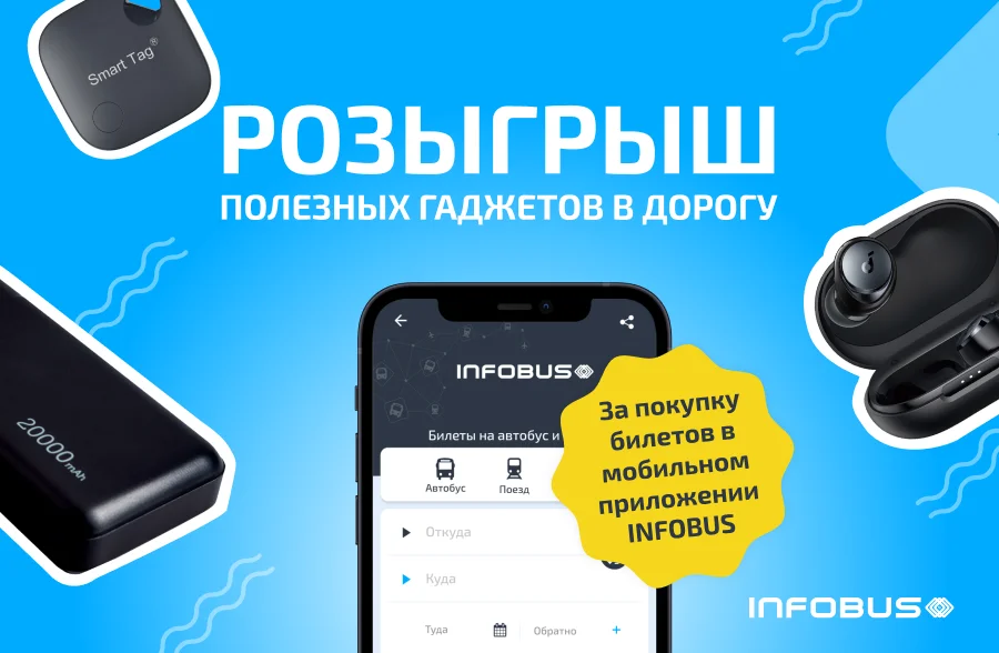 С 01.09 по 30.09 все, кто покупает билеты в мобильном приложении iOS или Android получают возможность принять участие в розыгрыше полезных гаджетов в дорогу от INFOBUS.