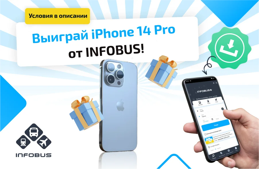 У нас отличные новости! С 01.08 по 31.08 все, кто покупает билеты в мобильном приложении iOS или Android получают возможность выиграть iPhone 14 Pro.