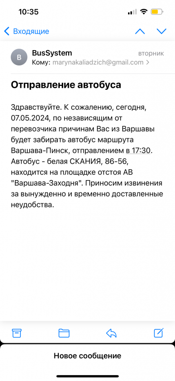 Автобус не приехал в назначенное время, мэйл я получила только за пол часа до отправления.