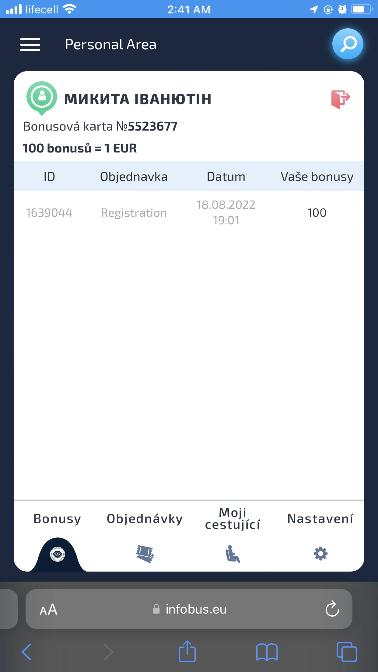 Abyste mohli bonusy dostat včas, zašlete nám prosím číslo své zákaznické bonusové karty, které najdete ve svém osobním účtu uživatele INFOBUS.
