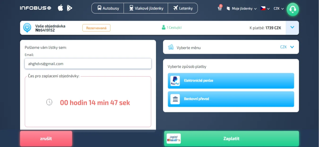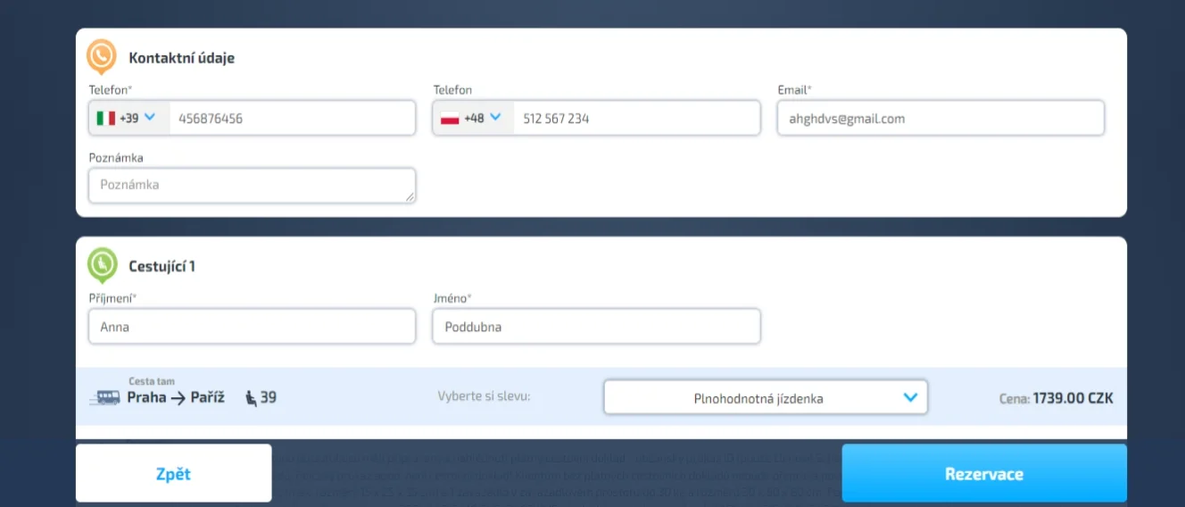 Po výběru vhodné letenky a kliknutí na tlačítko "Rezervovat" zadejte údaje o cestujícím. Jedná se o jméno, příjmení, telefonní číslo a e-mailovou adresu, na kterou bude jízdenka zaslána. Zaplaťte za jízdenku.