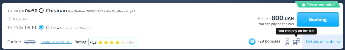 After pre-booking your order on the website, you have the option to pay the driver in cash. If you can't pay by card on the website, you can cancel your order without a refund if your plans change. You are guaranteed a seat in the bus, and the ticket price is fixed until payment is made.