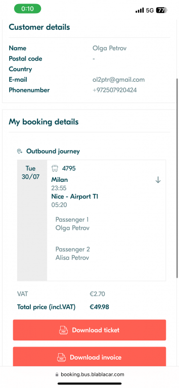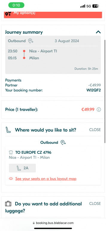 I had 2 booking : on 30/7 -Milano -Nice the bus late to end destination in 1,5 because issues during driving,