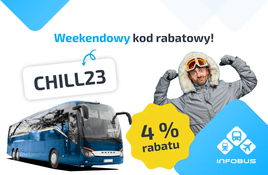 Nowy miesiąc nowego roku witamy dobrymi wiadomościami od INFOBUS! Promocja «Weekendowy kod rabatowy» trwa w styczniu! Skorzystajcie z 4% rabatu na wszystkie połączenia autobusowe z kodem rabatowym: CHILL23.