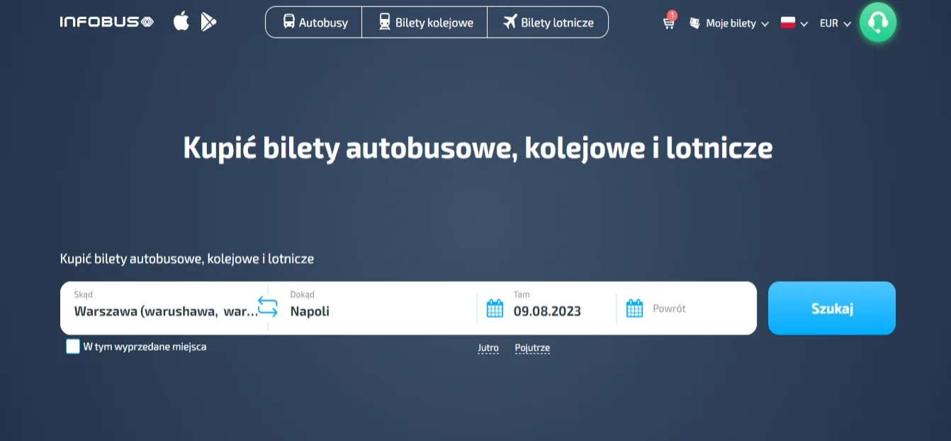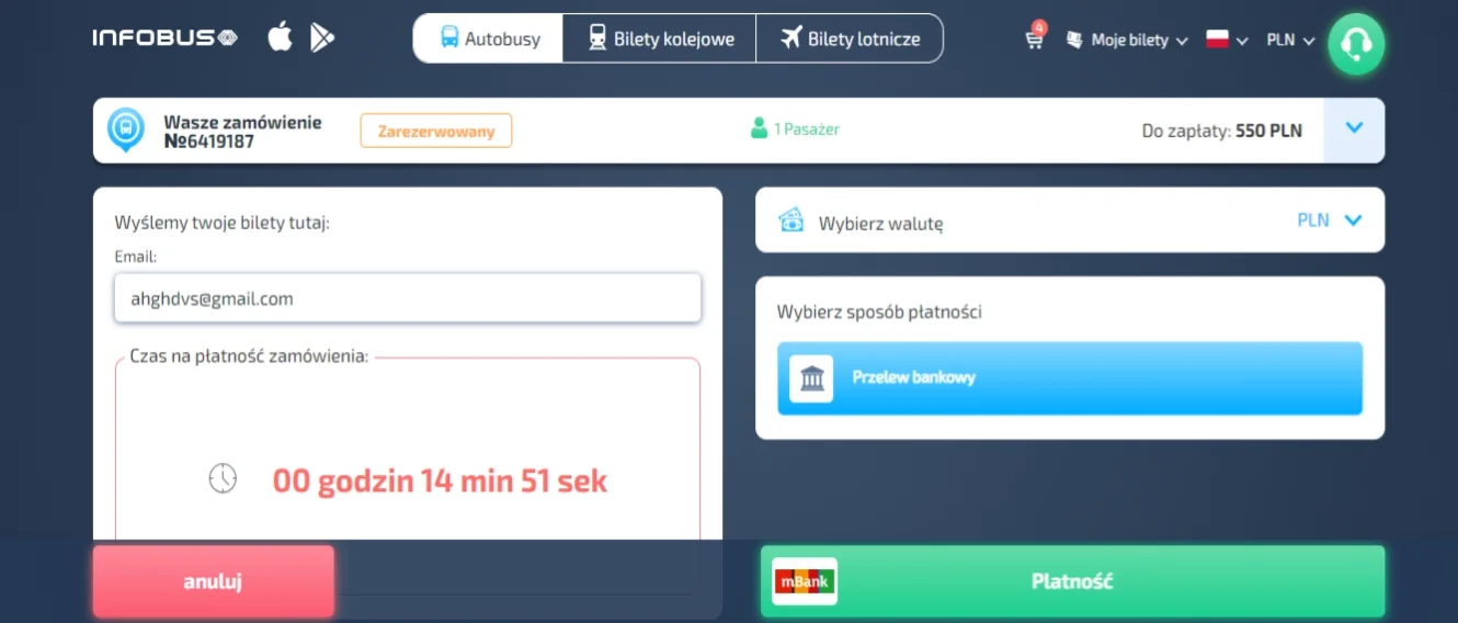 Kupując bilety na stronie INFOBUS, przekonasz się, że INFOBUS to szybka usługa online. Proces zakupu biletów autobusowych, kolejowych lub lotniczych zajmuje nie więcej niż 5 minut.