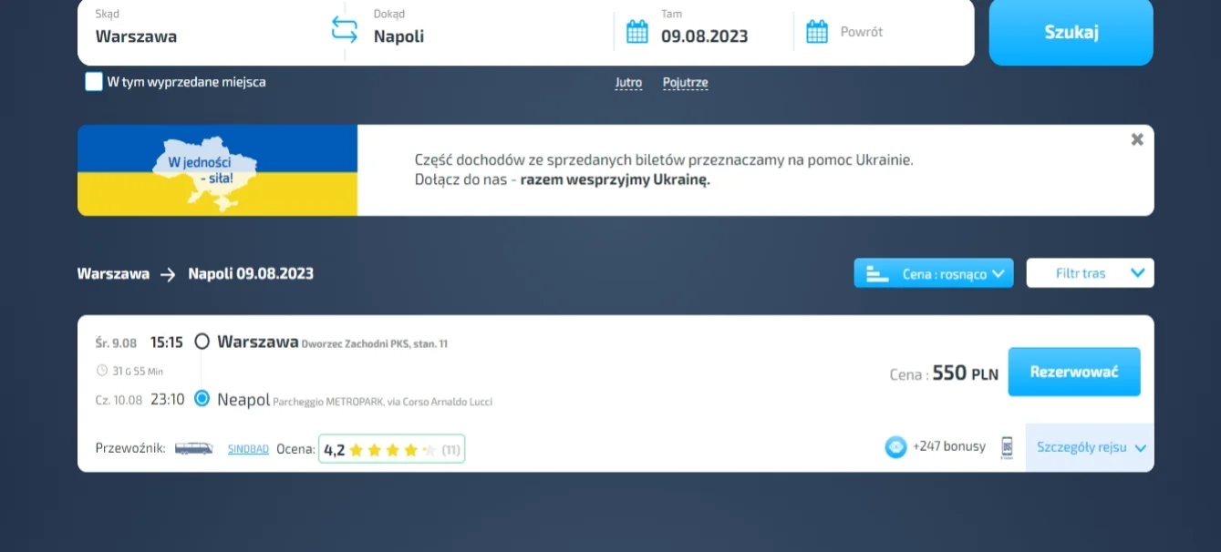 W wynikach wyszukiwania można również znaleźć informacje na temat godzin odjazdu i przyjazdu, czasu trwania podróży, planu podróży i ceny biletu jednorazowego.