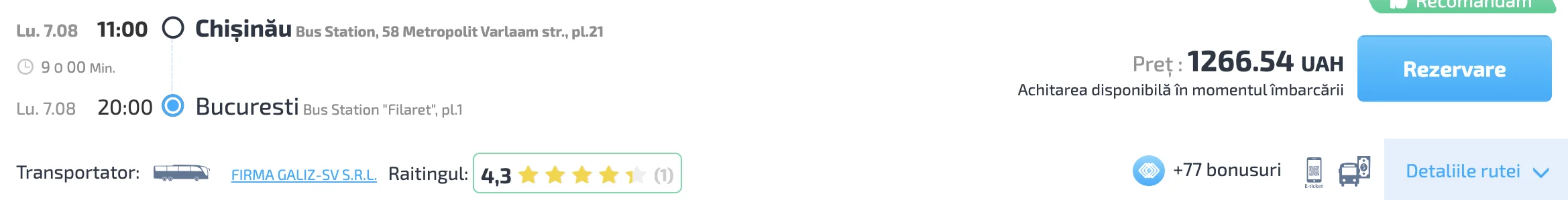 Bonusurile sunt o monedă virtuală pe site-ul INFOBUS care se acumulează la plata comenzilor. Puteți folosi bonusurile acumulate pentru a plăti bilete pentru viitoarele călătorii. Așadar, 100 de puncte bonus = 1 euro. Reducerea maximă posibilă la utilizarea bonusurilor este de 50% din prețul biletului.