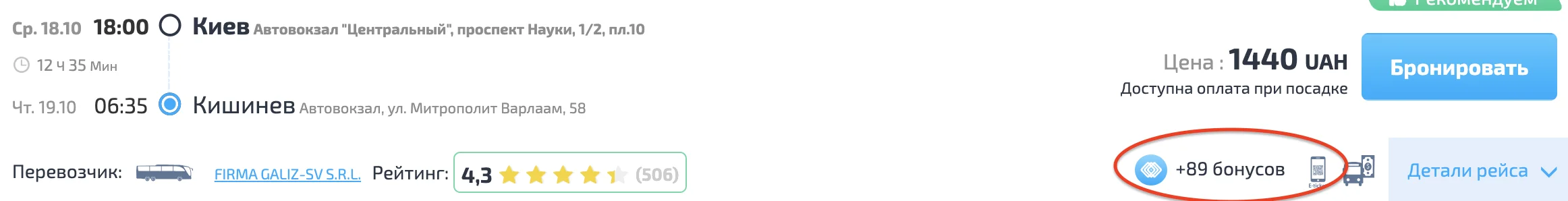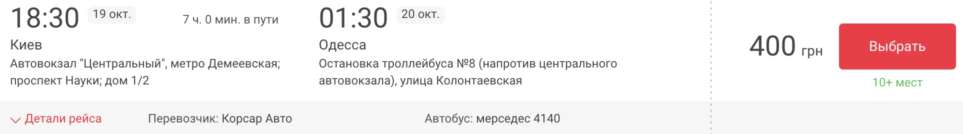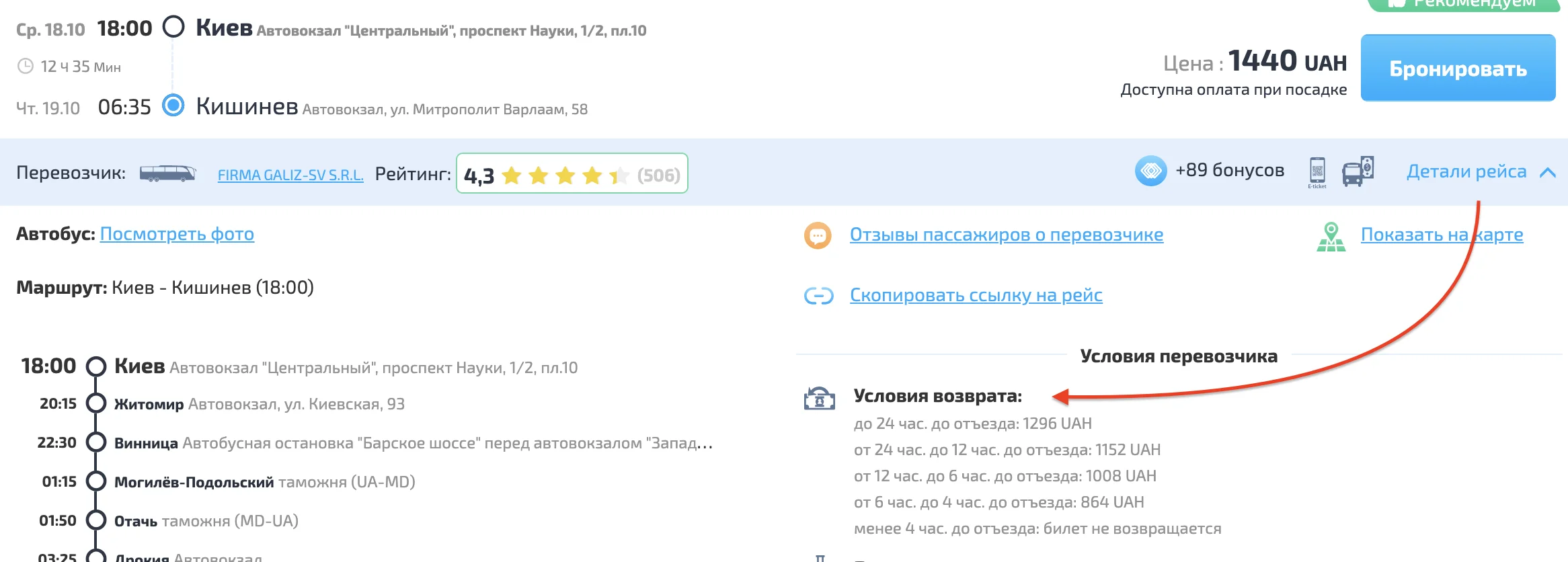 На других сайтах в доступе есть детали рейса, но в гораздо меньшем объеме: маршрут, перевозчик, условия возврата и функционал автобуса:
