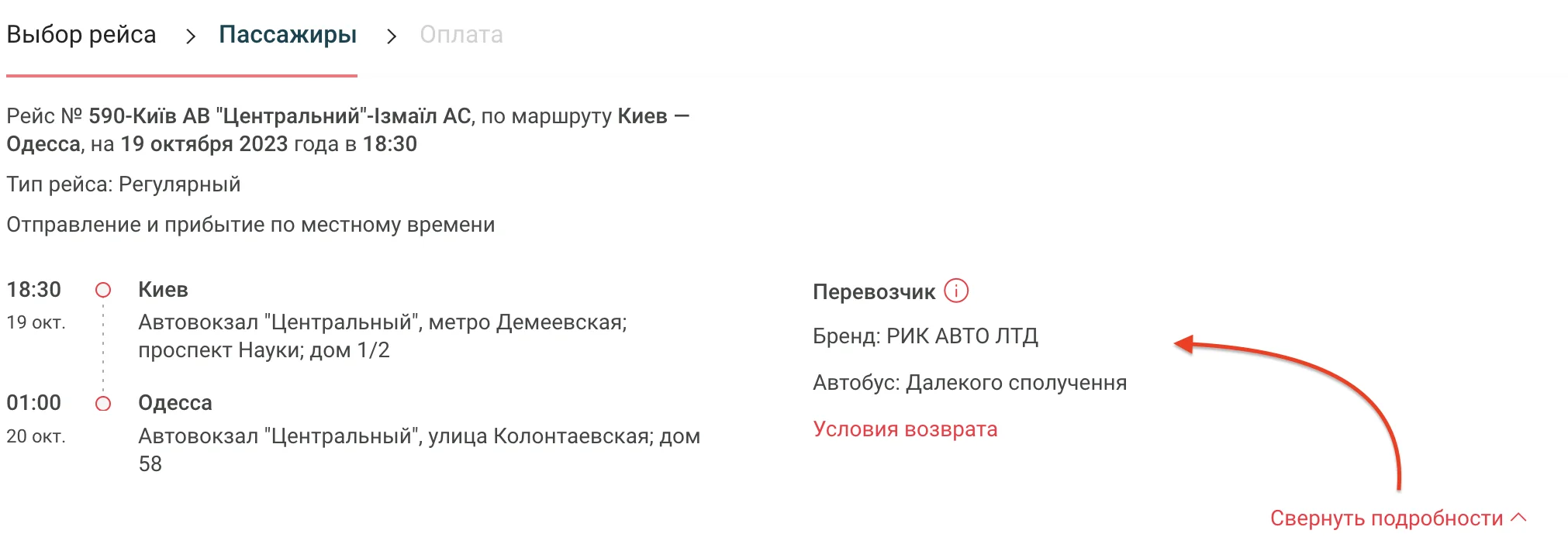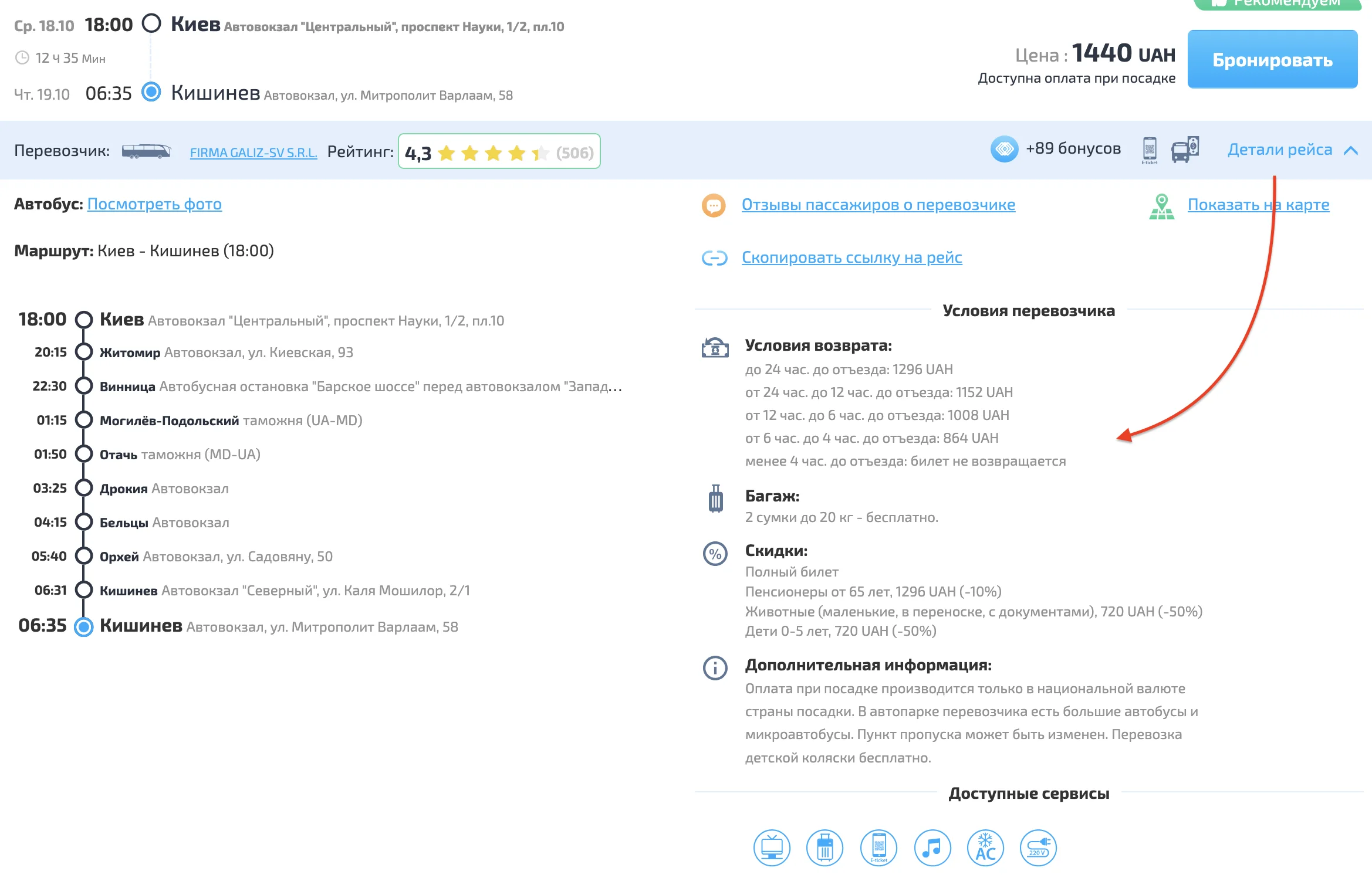 На сайте INFOBUS можно найти описание к рейсу в разделе "Детали рейса". Там представлены маршрут, скидки, информация о перевозчике, условия возврата билетов и перевозки багажа: