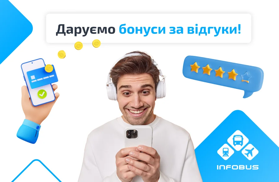 Ми знову з хорошими новинами! З 07.08 по 20.08 у вас буде можливість отримати до 600 бонусів на свій особистий рахунок за оригінальні відгуки про компанію, які потім можна перетворити на знижку до -50% під час купівлі квитків на сайті INFOBUS.