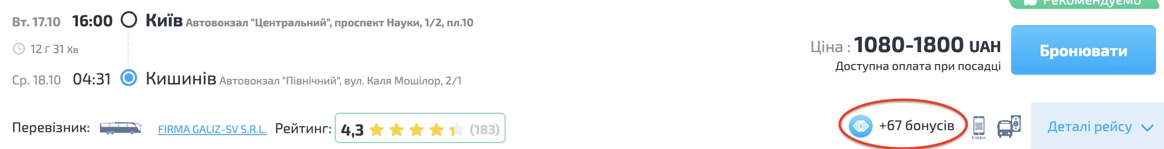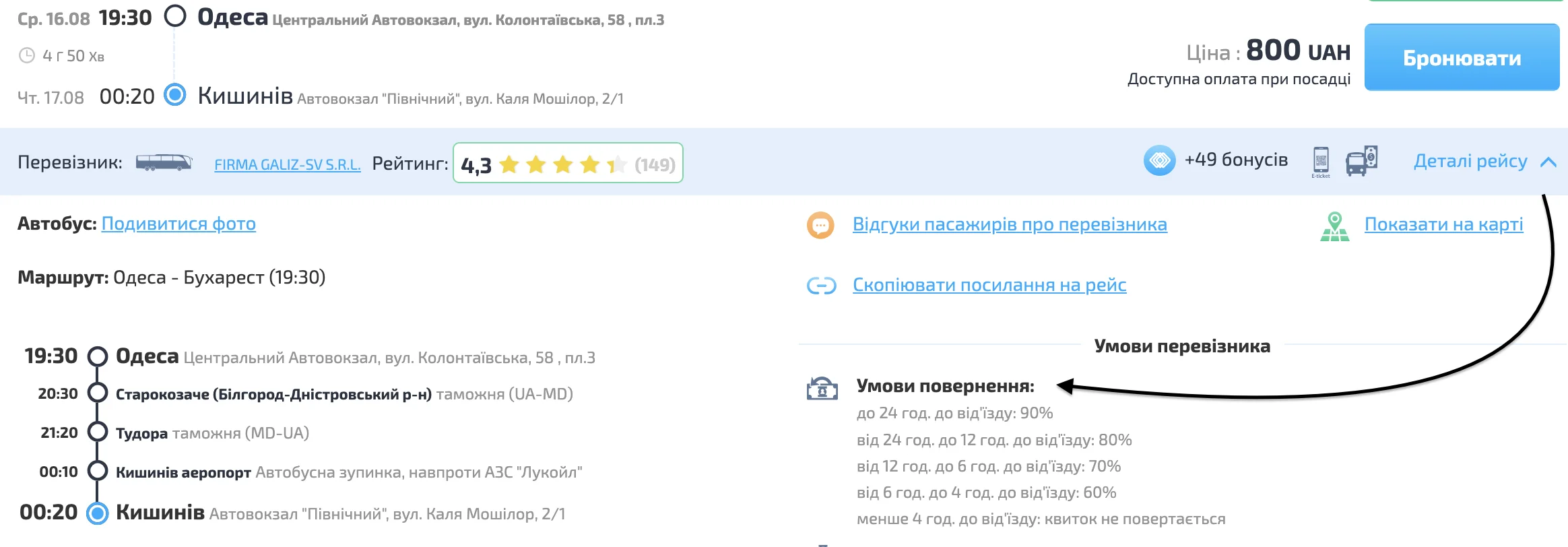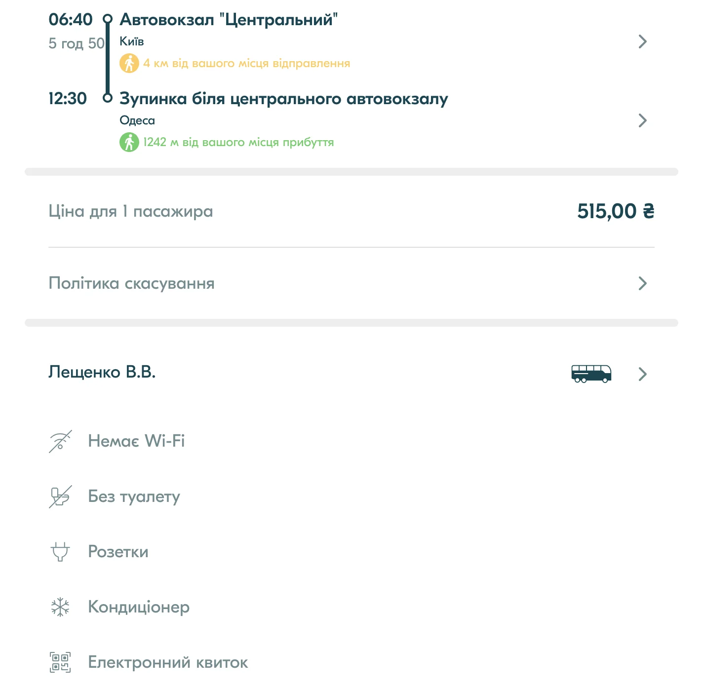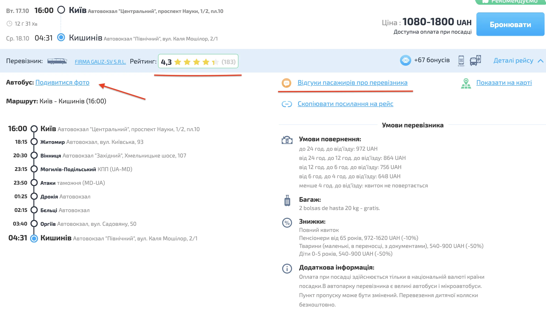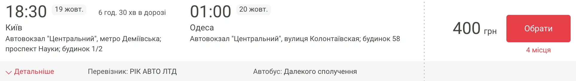 На інших сайтах в доступі є деталі рейсу, але в набагато меншому обсязі: маршрут, перевізник, умови повернення та функціонал автобусу: