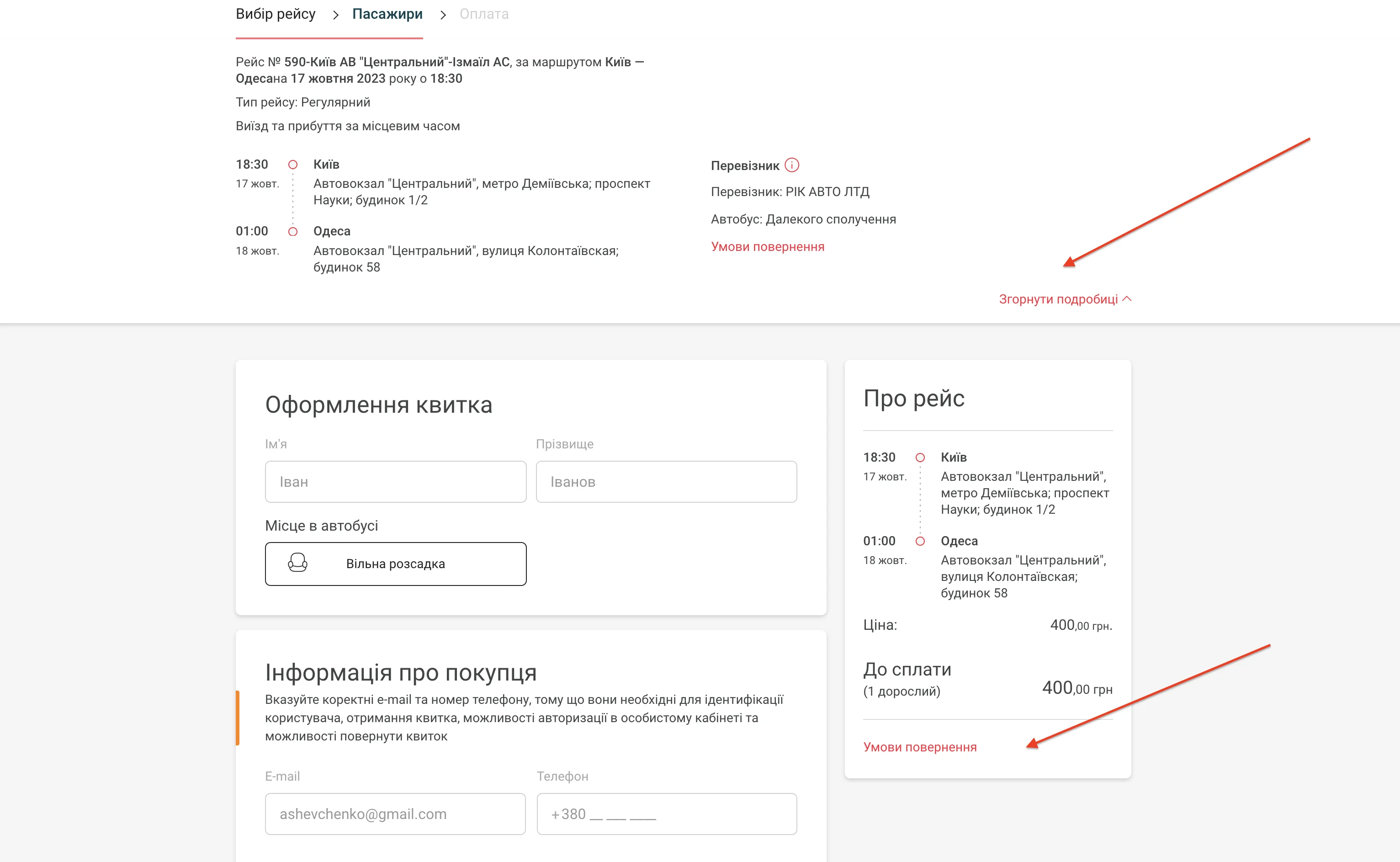 На сайті INFOBUS можна знайти опис до рейсу в розділі “Деталі рейсу”. Там представлені маршрут, знижки, інформація про перевізника, умови повернення квитків та перевезення багажу:
