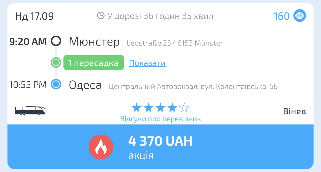 1. Знаходимо потрібний рейс до або з Німеччини на сайті INFOBUS або в мобільному додатку на iOS та Android.