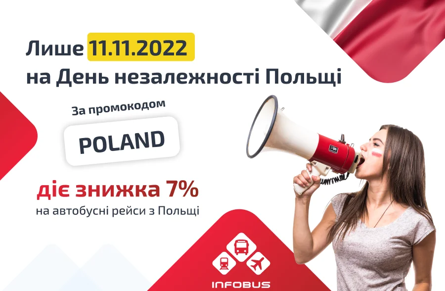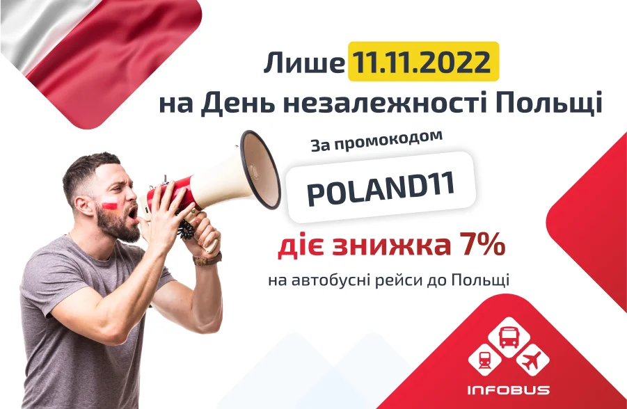 День Незалежності Польщі зі знижками від INFOBUS! З нагоди національного свята 11 листопада задаровуємо всіх клієнтів промокодами! Обирайте рейси з нашої підбірки з України в Польщу чи з Польщі в Україну, застосовуйте промокод і заощаджуйте на подорожах!