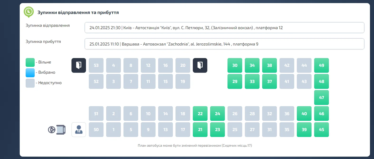 Деякі перевізники також надають можливість вибрати посадкове місце на схемі. Якщо така можливість недоступна, місце буде визначено водієм перед відправленням.