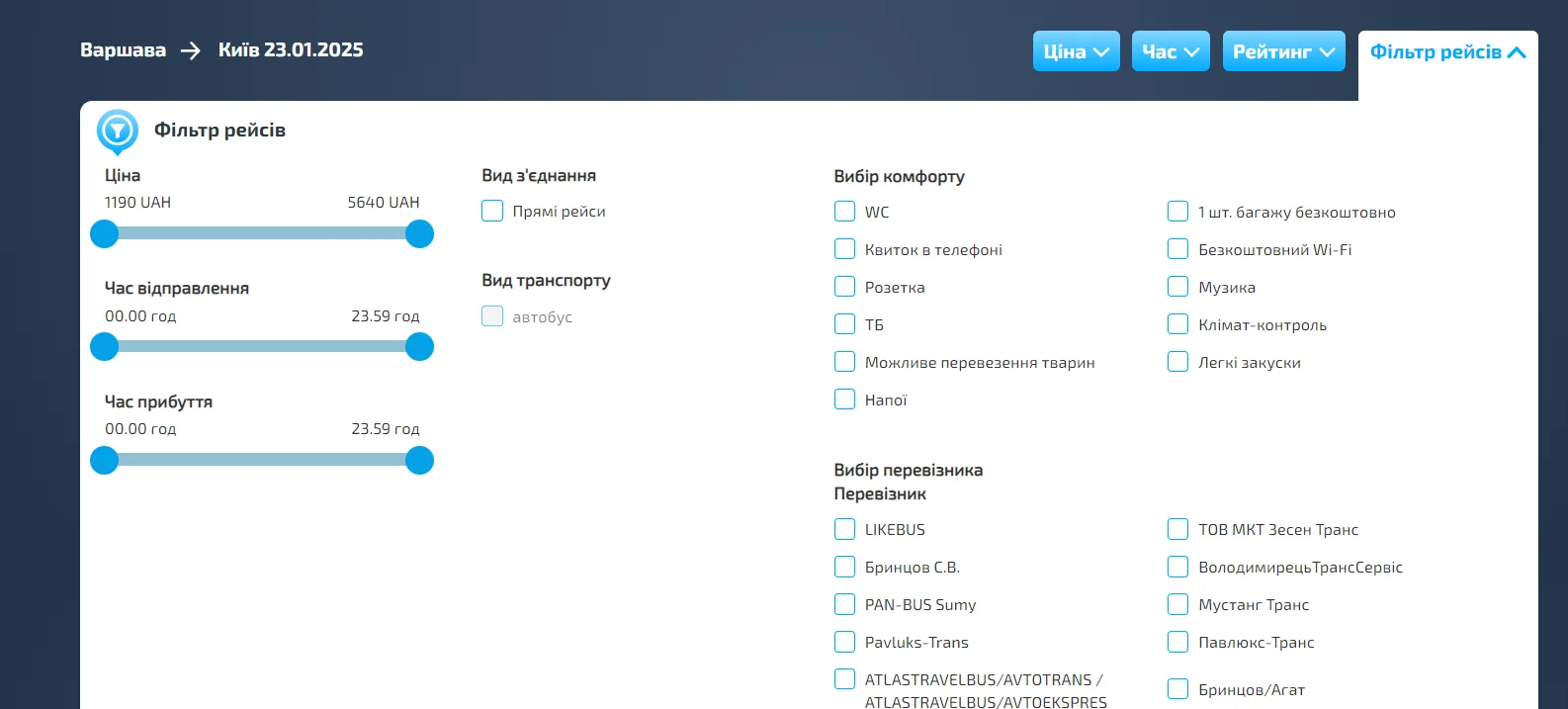 2. Після швидкого пошуку, система запропонує можливі варіанти різних перевізників. Пропозиції за зручністю ви можете відсортувати за: